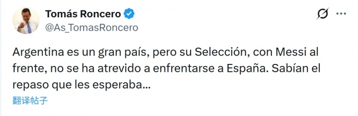 龙赛罗在社媒写道:阿根廷是个伟大的国家,但由梅西领衔的阿根廷国家队,却不敢直面西班牙。他们知道等待他们的将是什么...