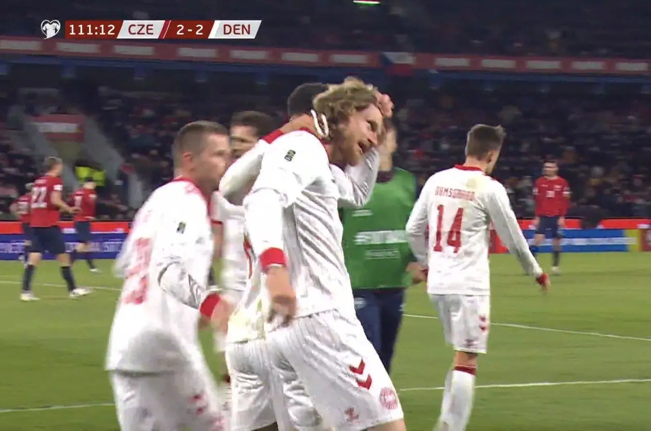 虎扑04月01日讯 北京时间4月1日凌晨02:45,世预赛欧洲区附加赛决赛捷克对阵丹麦。上半场第3分钟,舒尔茨闪击破门,下半场安诺生头球扳平。加时上半场100分钟,克雷伊奇禁区乱战破门,加时下半场111分钟,卡斯帕-霍头球再次扳平。120分钟结束,双方打平进入点球大战。